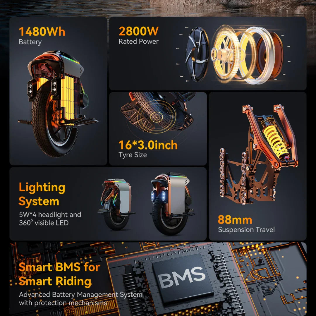 Jedes Detail am S16 Pro ist sorgfältig geplant. Pedale mit Spikes bieten hervorragenden Halt bei allen Wetterbedingungen. Ein vollständig integrierter Ständer ermöglicht einfaches Parken, während der eingebaute Trolley-Griff das Tragen und Führen des Einrads erleichtert. An der Oberseite befindet sich ein großes 32x32 Punktmatrix-Display, das Geschwindigkeit, Batteriestatus und andere wichtige Informationen anzeigt.