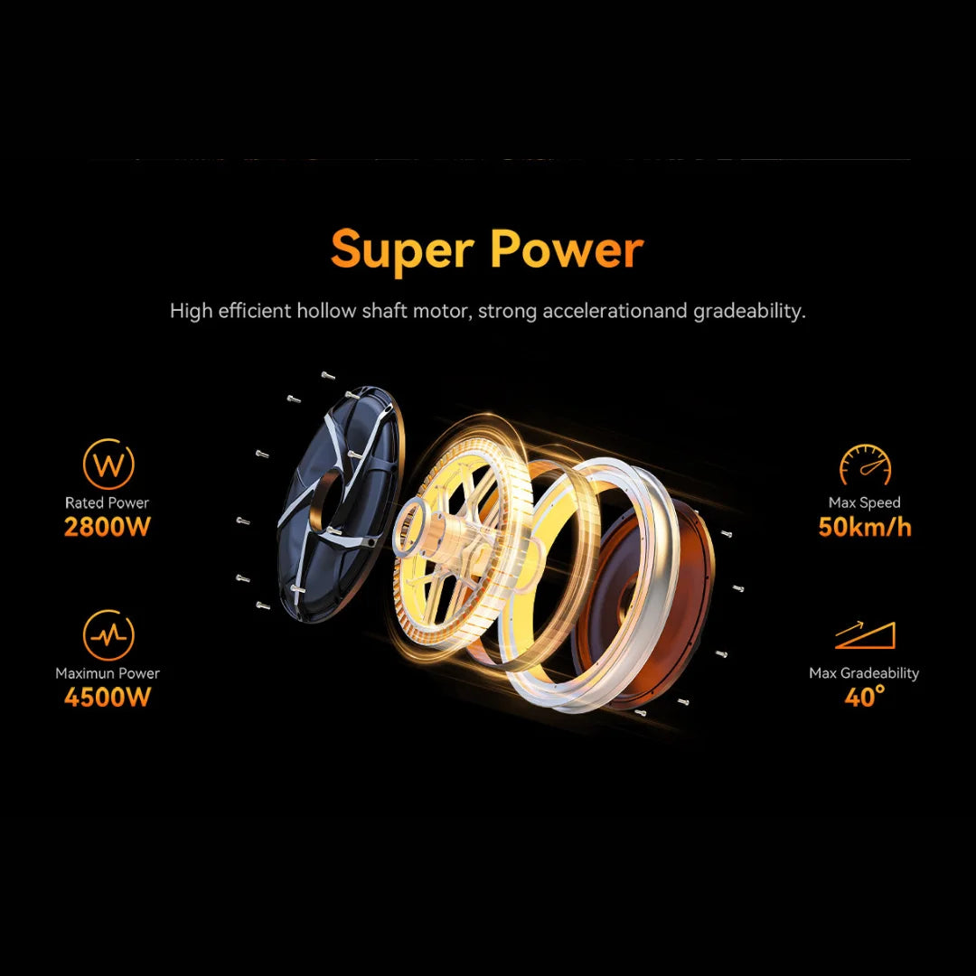 Das KingSong S16 Pro wird von einem hocheffizienten Hohlwellenmotor mit einer Nennleistung von 3000W angetrieben, der eine Spitzenleistung von 5000W erreicht. Dies gewährleistet eine starke Beschleunigung und eine außergewöhnliche Fähigkeit, Steigungen von bis zu 48° zu bewältigen. Unabhängig vom Gelände bietet das S16 Pro eine dynamische und reaktionsschnelle Fahrt, die Sie nicht im Stich lässt.