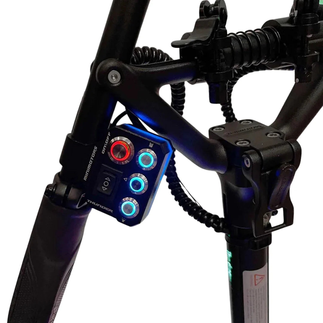Seien Sie unter allen Bedingungen sichtbar und sicher. Der Thunder 2 verfügt über ein umfassendes Beleuchtungspaket, einschließlich eines leistungsstarken Frontscheinwerfers, eines Rücklichts, Bremslichtern, Warnblinklichtern und integrierten Blinkern. Für zusätzliche Sicherheit im Verkehr sorgt eine extrem laute Hupe dafür, dass andere Sie immer bemerken.