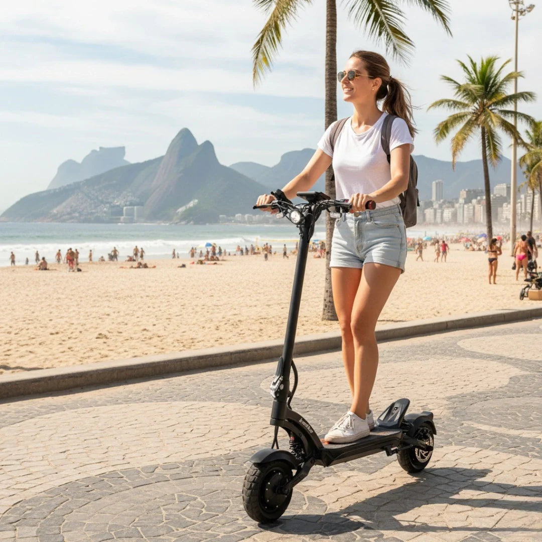 Ihre Sicherheit steht an erster Stelle. Deshalb ist der Roller mit einem leistungsstarken Bremssystem ausgestattet, das hydraulische Scheibenbremsen vorne und hinten (140 mm) sowie eine E-ABS elektronische Bremse mit Energierückgewinnung umfasst. Diese Kombination sorgt für zuverlässiges und reaktionsschnelles Anhalten unter allen Bedingungen. Die IPX5-Wasserfestigkeit für den gesamten Roller und IPX7 für das Display ermöglichen sorgenfreies Fahren auch an regnerischen Tagen.