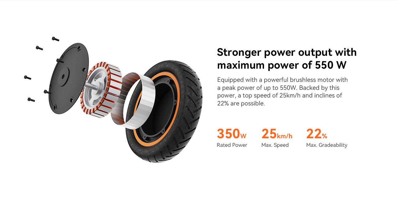 Der Roller KingSong E1 wird von einem leistungsstarken bürstenlosen Motor mit einer Nennleistung von 350 W angetrieben, der eine Spitzenleistung von bis zu 550 W erreicht. Dies sorgt für eine hervorragende Beschleunigung und ermöglicht Geschwindigkeiten von bis zu 25 km/h (begrenzt). Der Motor bewältigt mühelos Steigungen von bis zu 22 %, sodass Sie auch in abwechslungsreicheren Stadtgebieten sorgenfrei fahren können. Es stehen drei Fahrmodi zur Verfügung (Fußgänger, Standard, Sport), mit denen Sie die Geschwindigkeit an Ihre Bedürfnisse anpassen können.