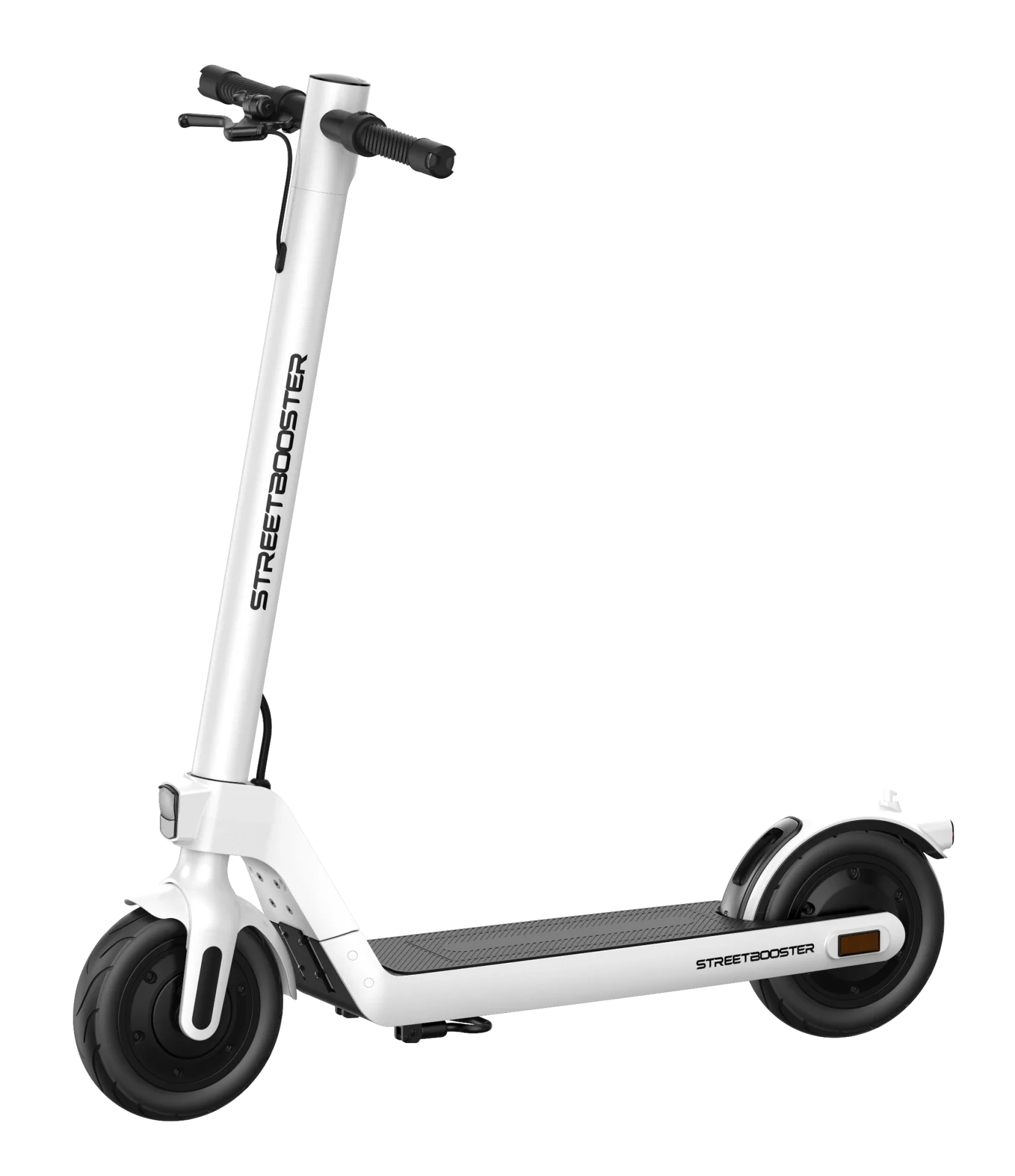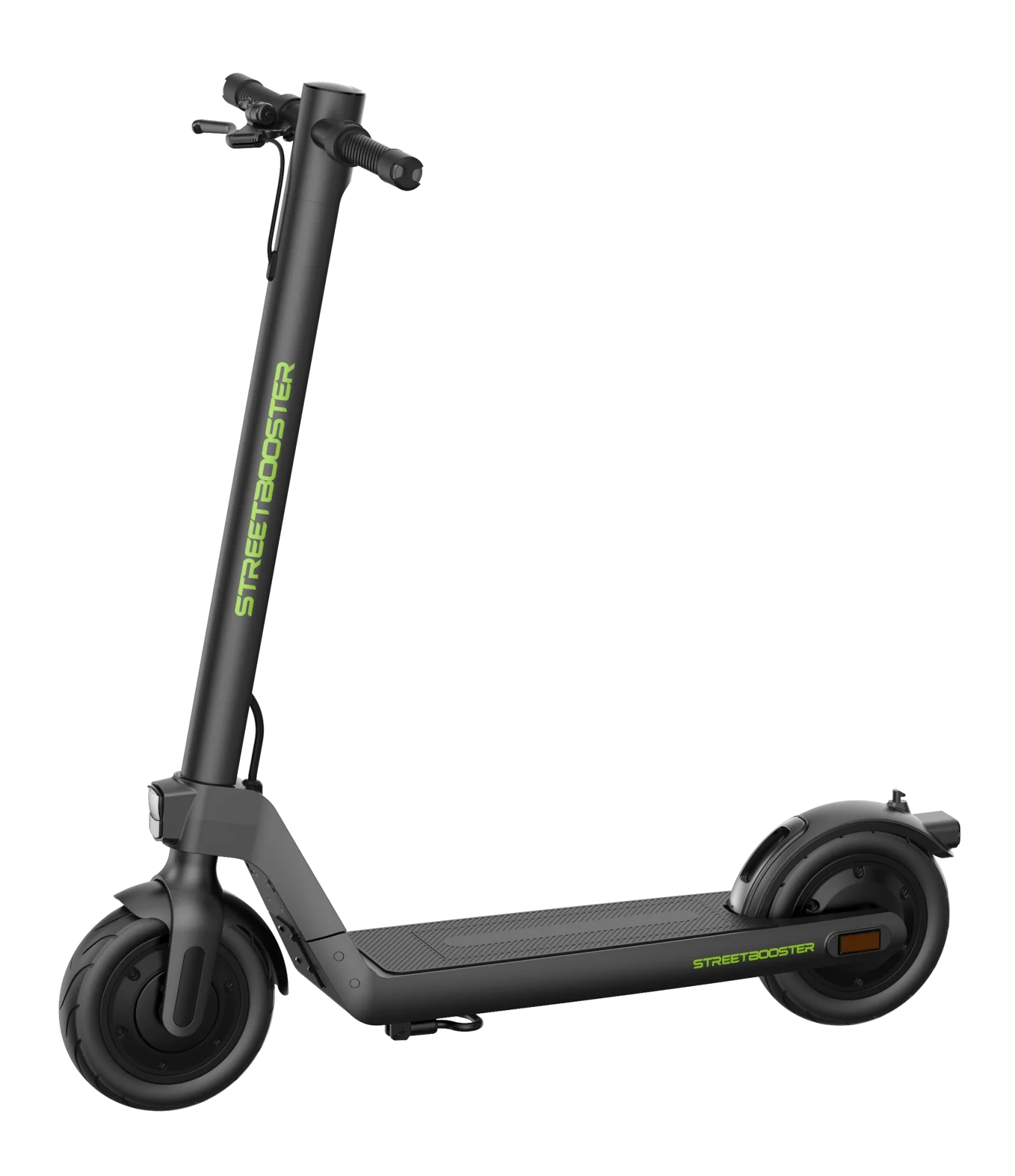 Das Fahren mit dem STREETBOOSTER Sirius Roller ist dank der großen 10-Zoll-Reifen äußerst komfortabel. Diese sind luftgefüllt, aber schlauchlos, was das Pannenrisiko verringert und gleichzeitig eine hervorragende Vibrationsdämpfung auf unebenen Oberflächen bietet. Die Reifen sorgen für Stabilität und eine gute Bodenhaftung.