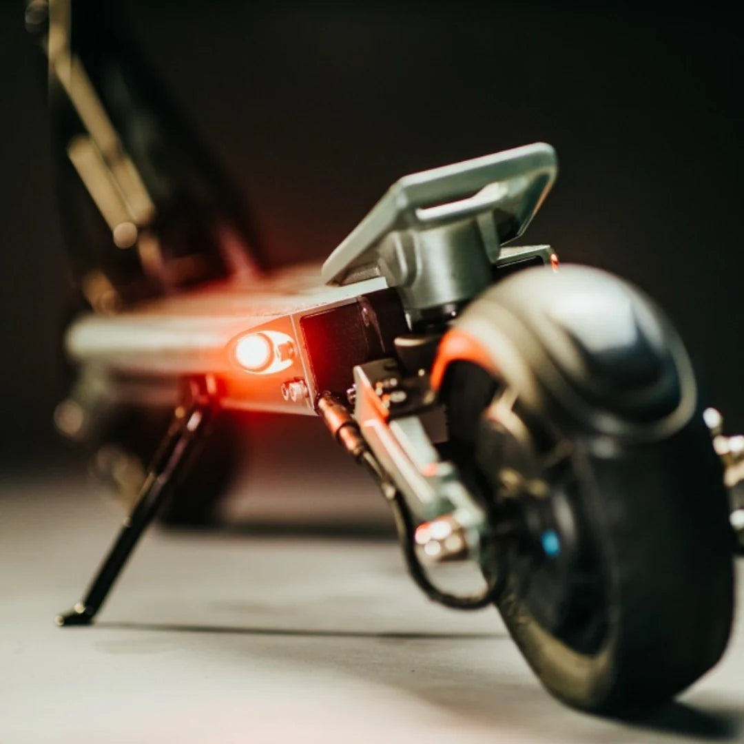 Ihre Sicherheit steht an erster Stelle. Der Vsett 8 ist mit einem zuverlässigen Bremssystem ausgestattet, das über Trommelbremsen vorne und hinten verfügt, unterstützt durch eine elektrische regenerative Bremse. Ein umfassendes Beleuchtungssystem sorgt für maximale Sichtbarkeit im Verkehr: ein dualer LED-Scheinwerfer, ein Rücklicht, ein Bremslicht und intuitive Blinker, die einfach über Tasten am Lenker gesteuert werden.