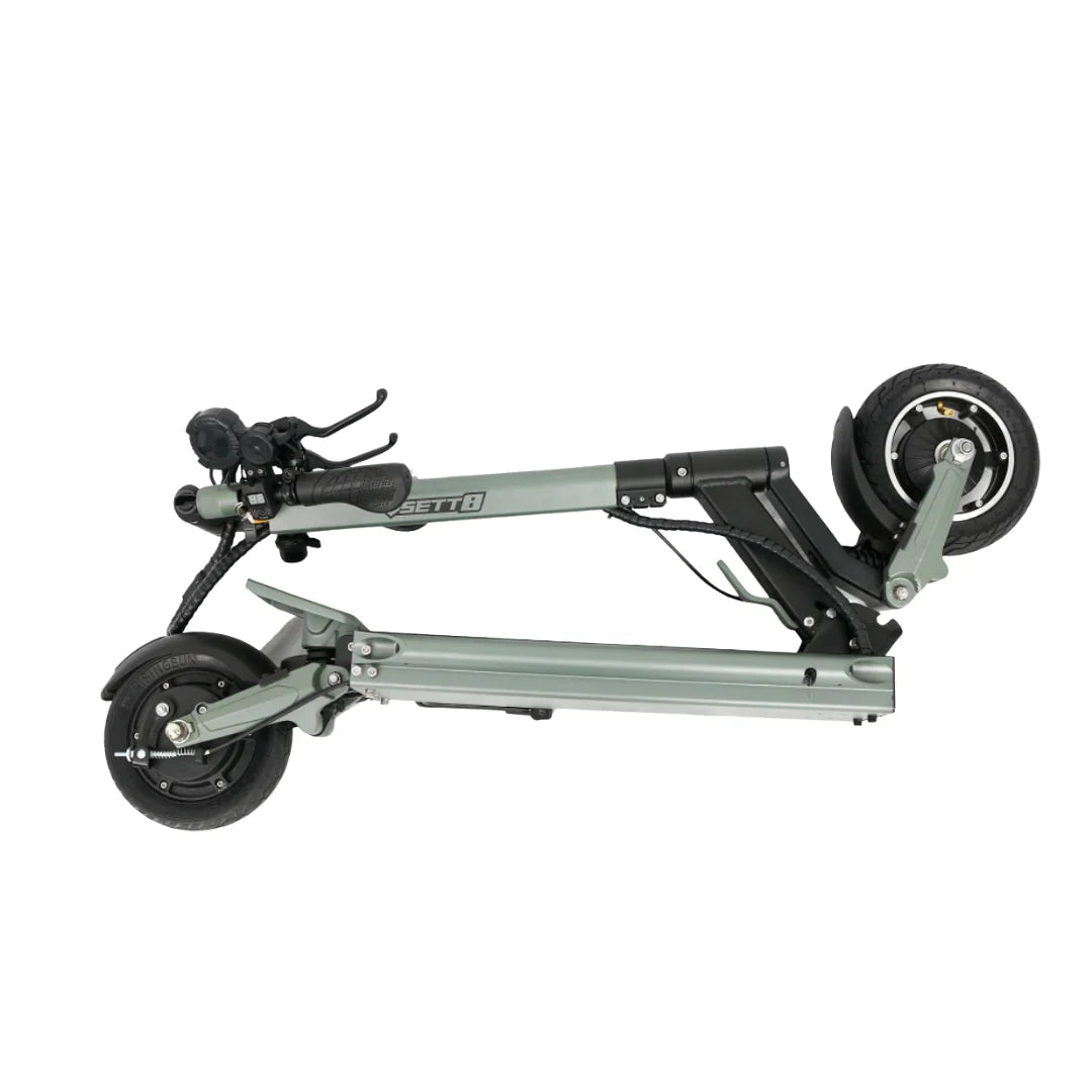 Der Rahmen des Rollers besteht aus einer hochfesten Aluminiumlegierung in Luftfahrtqualität (6082-T6), die Stärke und Haltbarkeit bei geringem Gewicht gewährleistet. Der Vsett 8 ist auf maximale Praktikabilität ausgelegt – er ist vollständig zusammenklappbar. Sie können den Lenker und die Lenkstange schnell und einfach einklappen, sodass Sie den Roller im Kofferraum eines Autos, unter einem Schreibtisch verstauen oder einfach mit sich führen können.