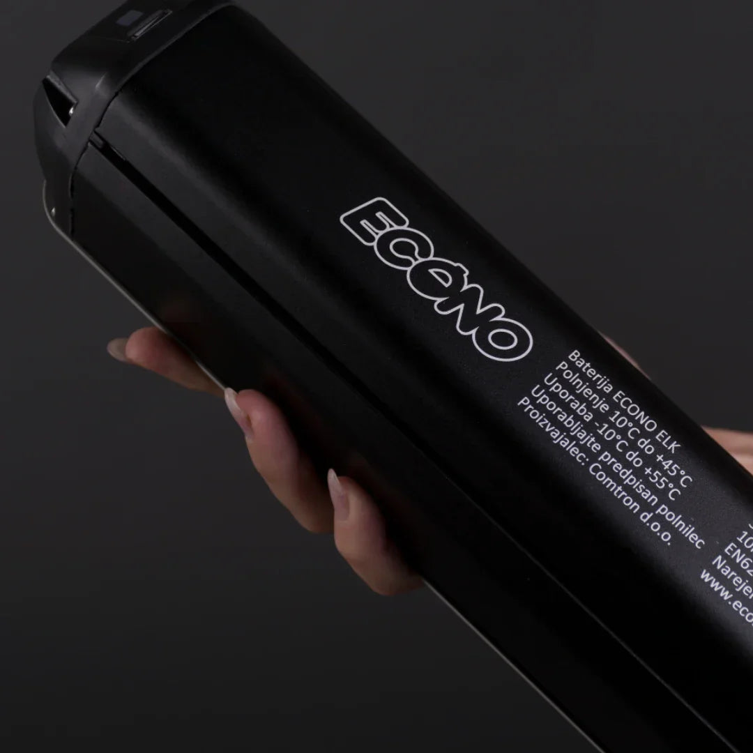 Napajanje osigurava pouzdana ECONO baterija, koju razvijamo i sastavljamo u Sloveniji. Dostupna je u tri različita kapaciteta, tako da možete odabrati domet koji najbolje odgovara vašim potrebama: 520 Wh, 700 Wh ili 800 Wh. Sve baterije se lako uklanjaju i međusobno su zamjenjive između naših modela za 2025. godinu, što vam pruža maksimalnu fleksibilnost.