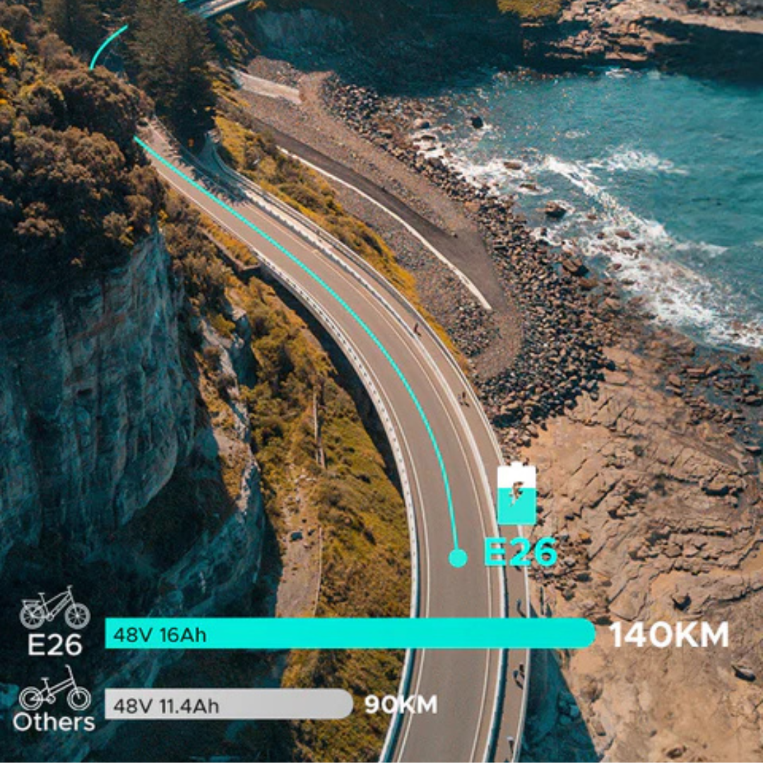 Električni bicikl Engwe E26 dizajniran je za avanturiste i svakodnevne putnike koji ne žele biti ograničeni na asfaltirane ceste. Sa svojim dvostrukim ovjesom, snažnim motorom i širokim gumama, idealan je za one koji traže vrhunsku udobnost i performanse na raznolikim terenima, šumskim stazama ili gradskim ulicama. Savršen je izbor za svakoga tko želi pouzdan i svestran bicikl za istraživanje bez ograničenja.