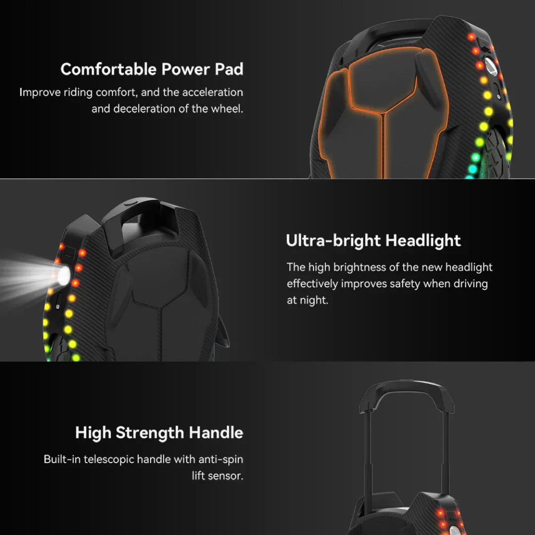 Ergonomski bočni jastučići (Power Pads) osiguravaju maksimalnu udobnost tijekom vožnje. Poboljšavaju prianjanje i omogućuju bolju kontrolu nad ubrzavanjem i kočenjem. Ugrađena teleskopska ručka sa senzorom protiv okretanja ("anti-spin") olakšava nošenje, jer se motor automatski isključuje kada podignete monocikl.