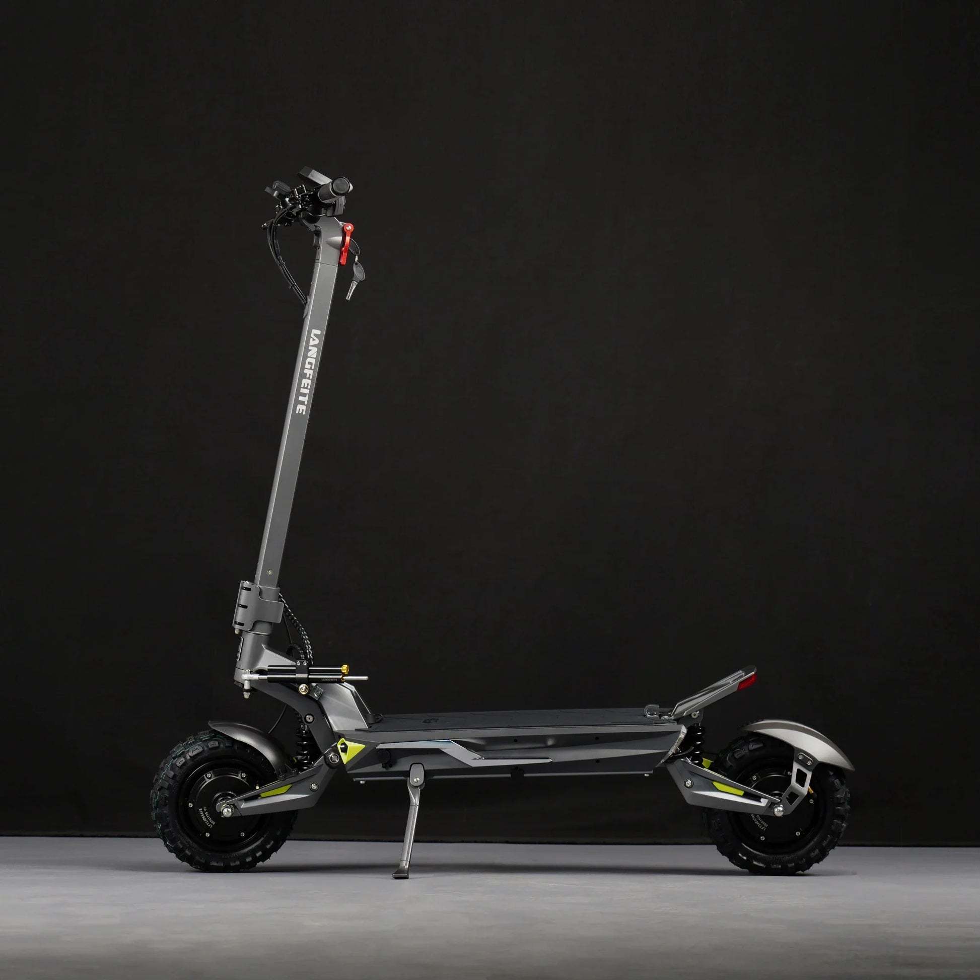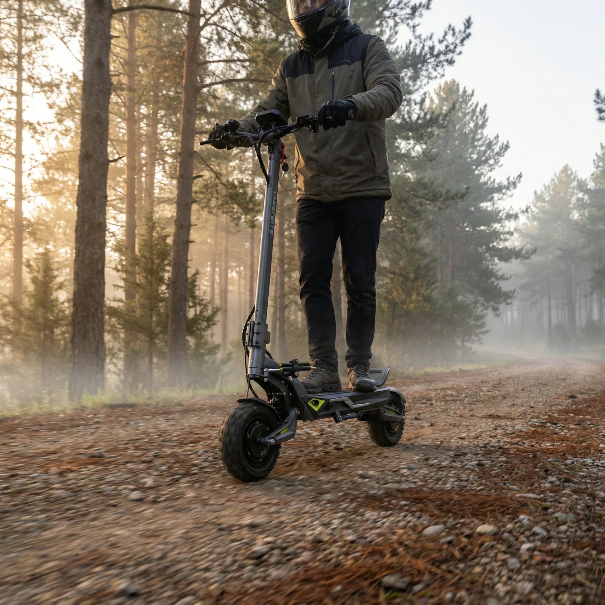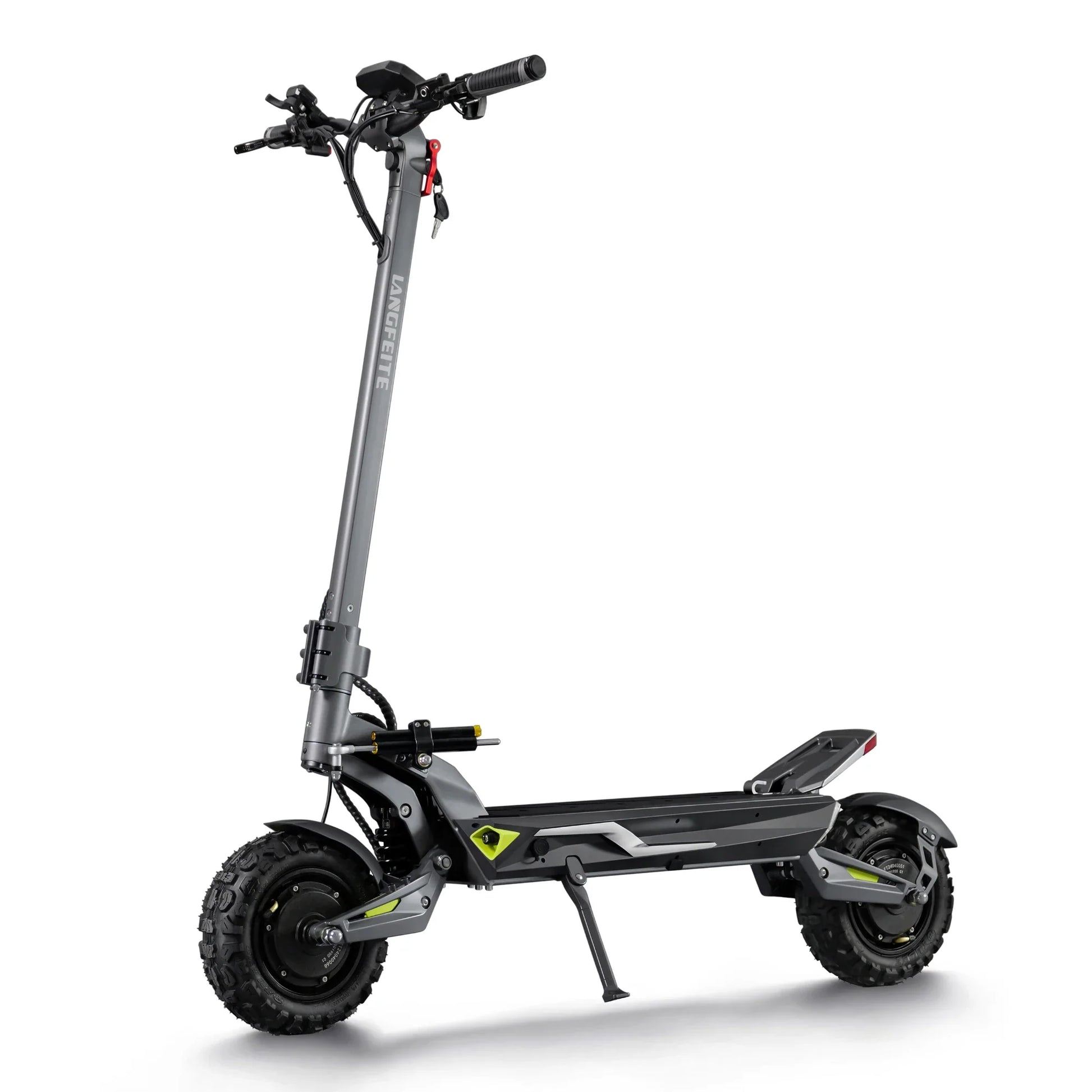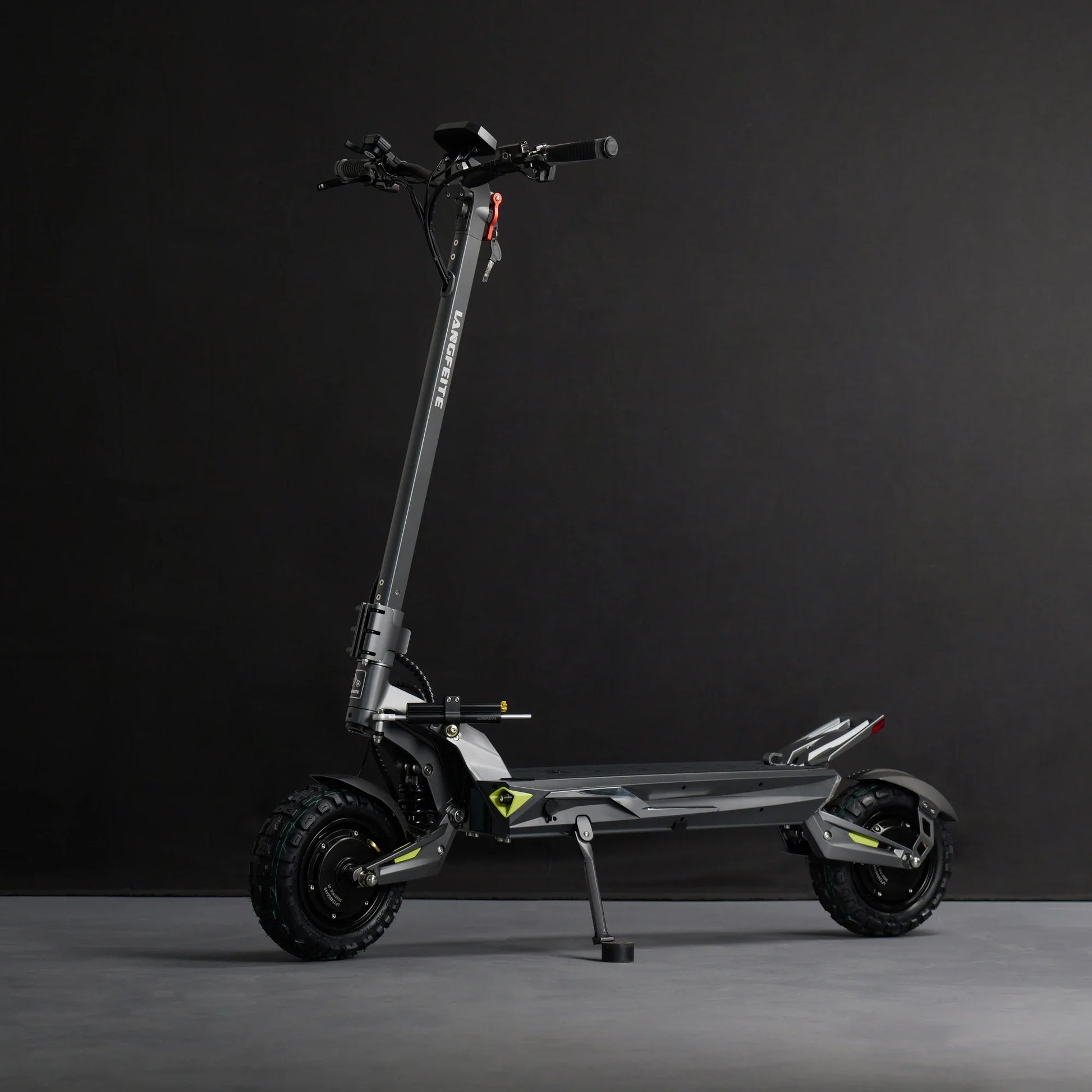 Il comfort viene prima di tutto. Il Langfeite C1 è dotato di sospensione idraulica anteriore e posteriore con molla elicoidale (Hydraulic coil shock). Un robusto forcellone e un telaio in lega di alluminio forgiato in un unico pezzo assicurano che il monopattino assorba efficacemente urti e vibrazioni, sia che si guidi sul pavé cittadino che su sentieri forestali.