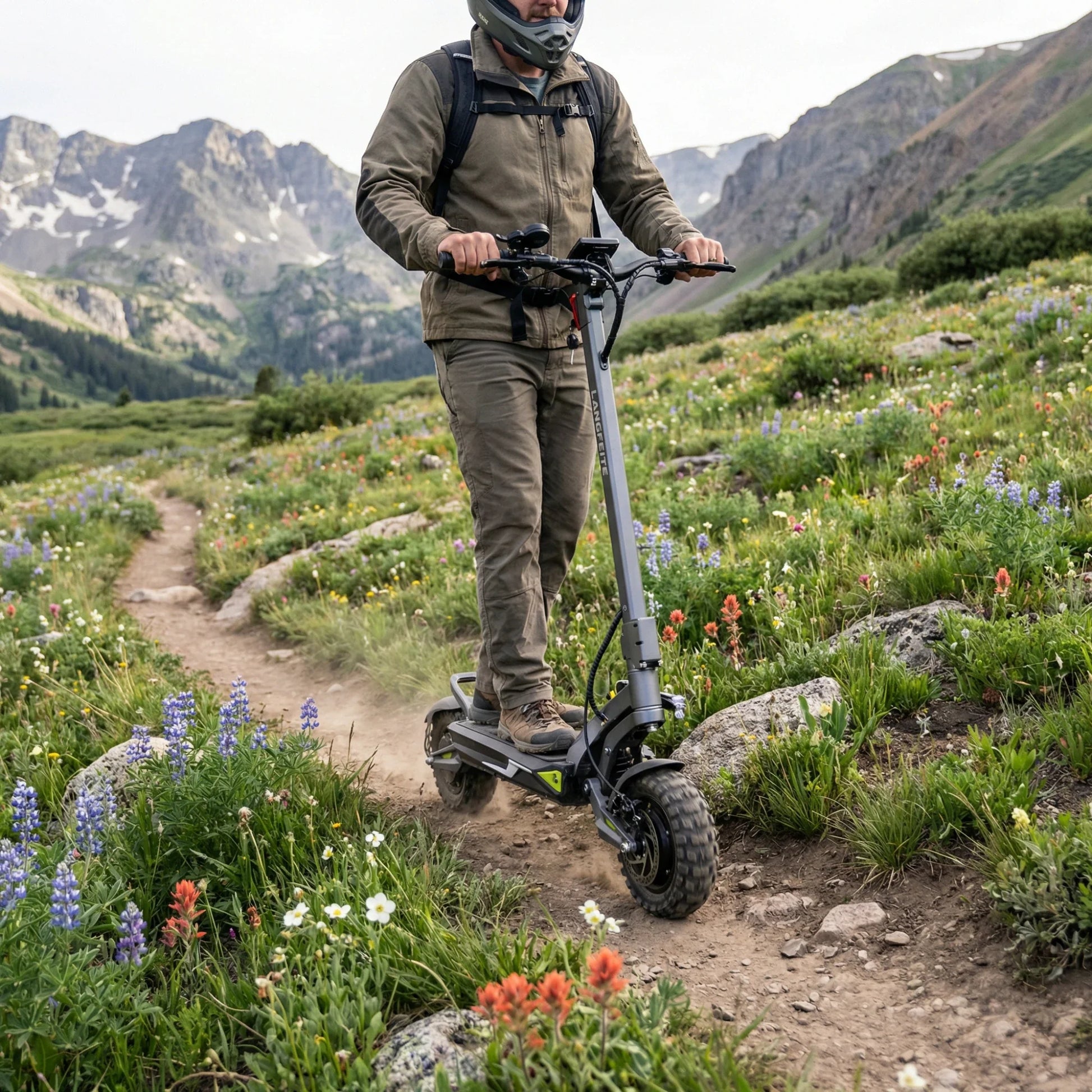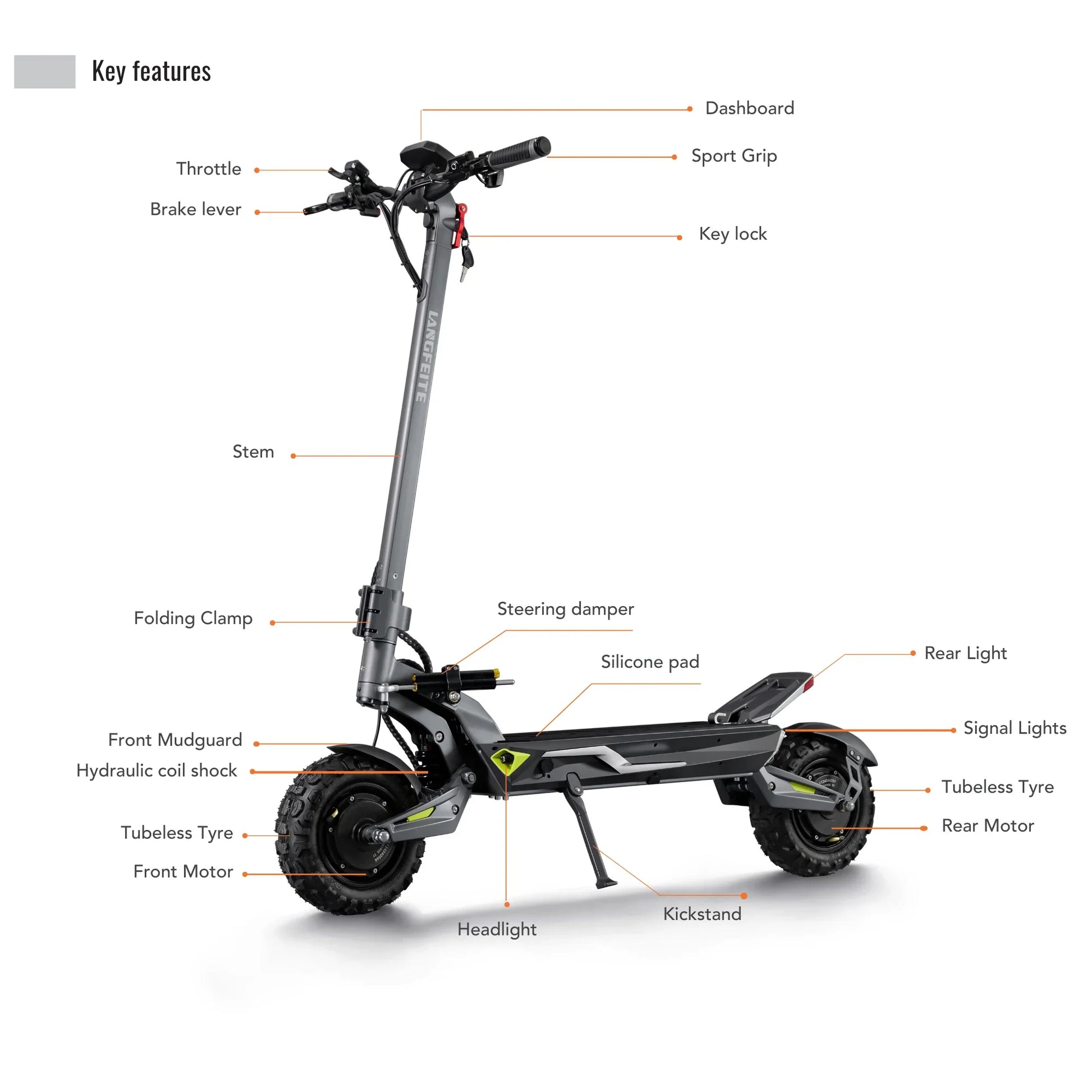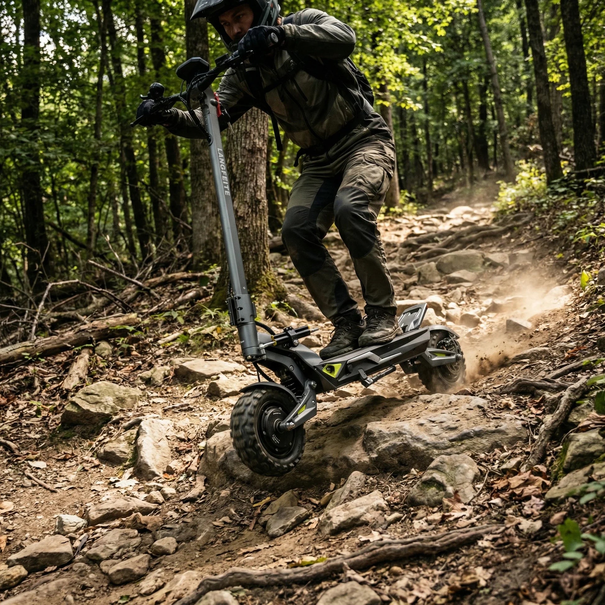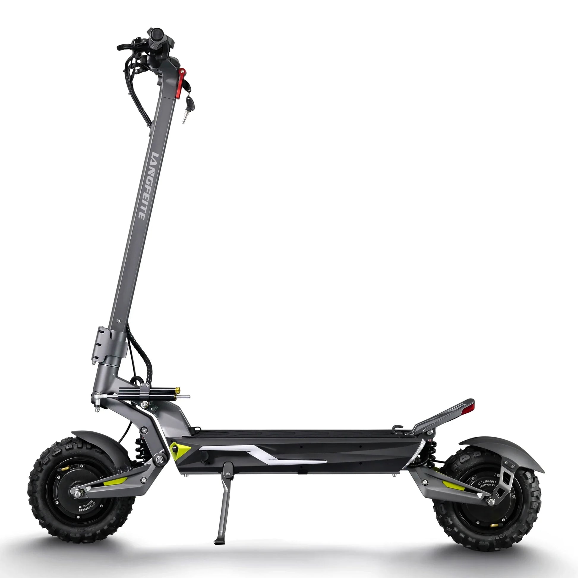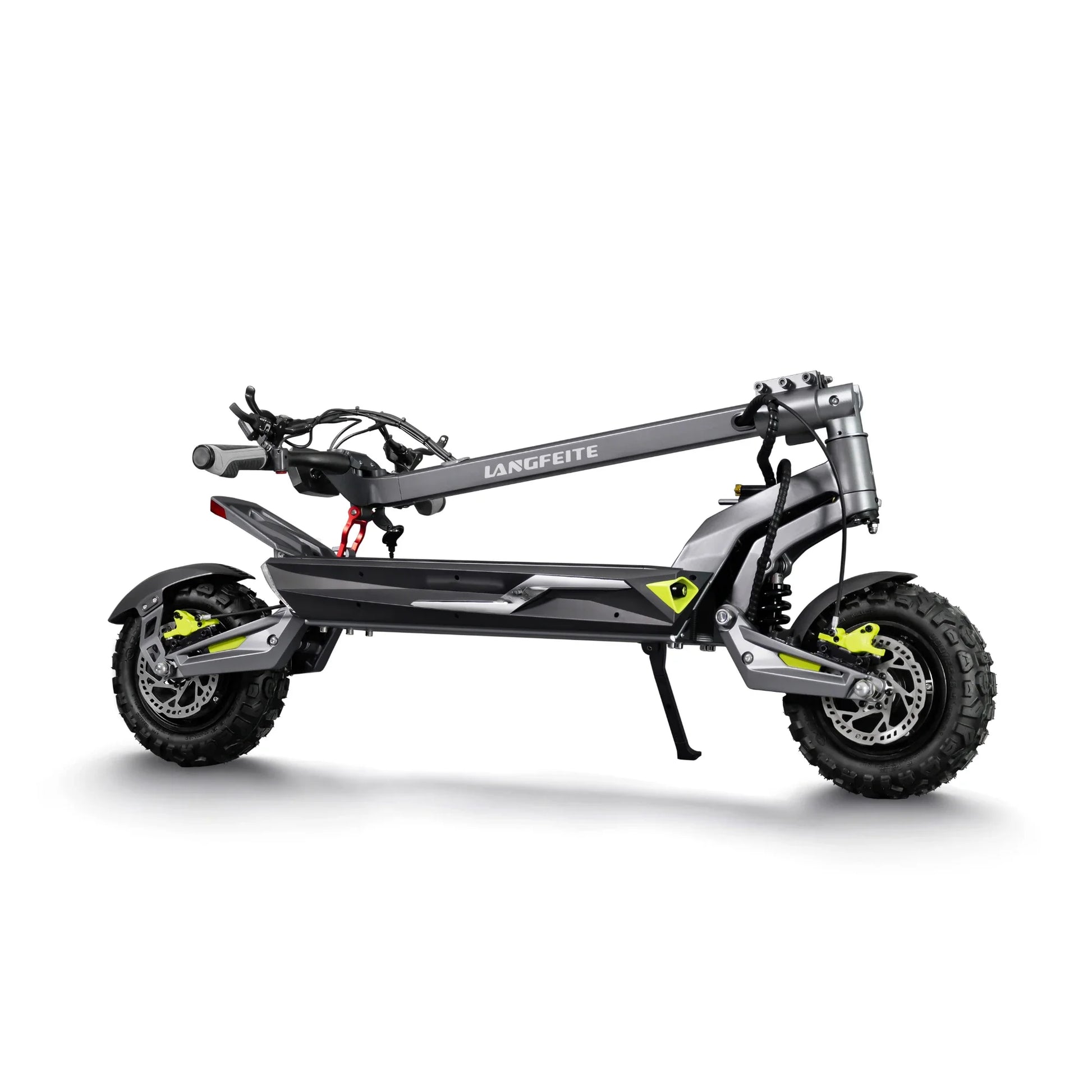 Il comfort viene prima di tutto. Il Langfeite C1 è dotato di sospensione idraulica anteriore e posteriore con molla elicoidale (Hydraulic coil shock). Un robusto forcellone e un telaio in lega di alluminio forgiato in un unico pezzo assicurano che il monopattino assorba efficacemente urti e vibrazioni, sia che si guidi sul pavé cittadino che su sentieri forestali.