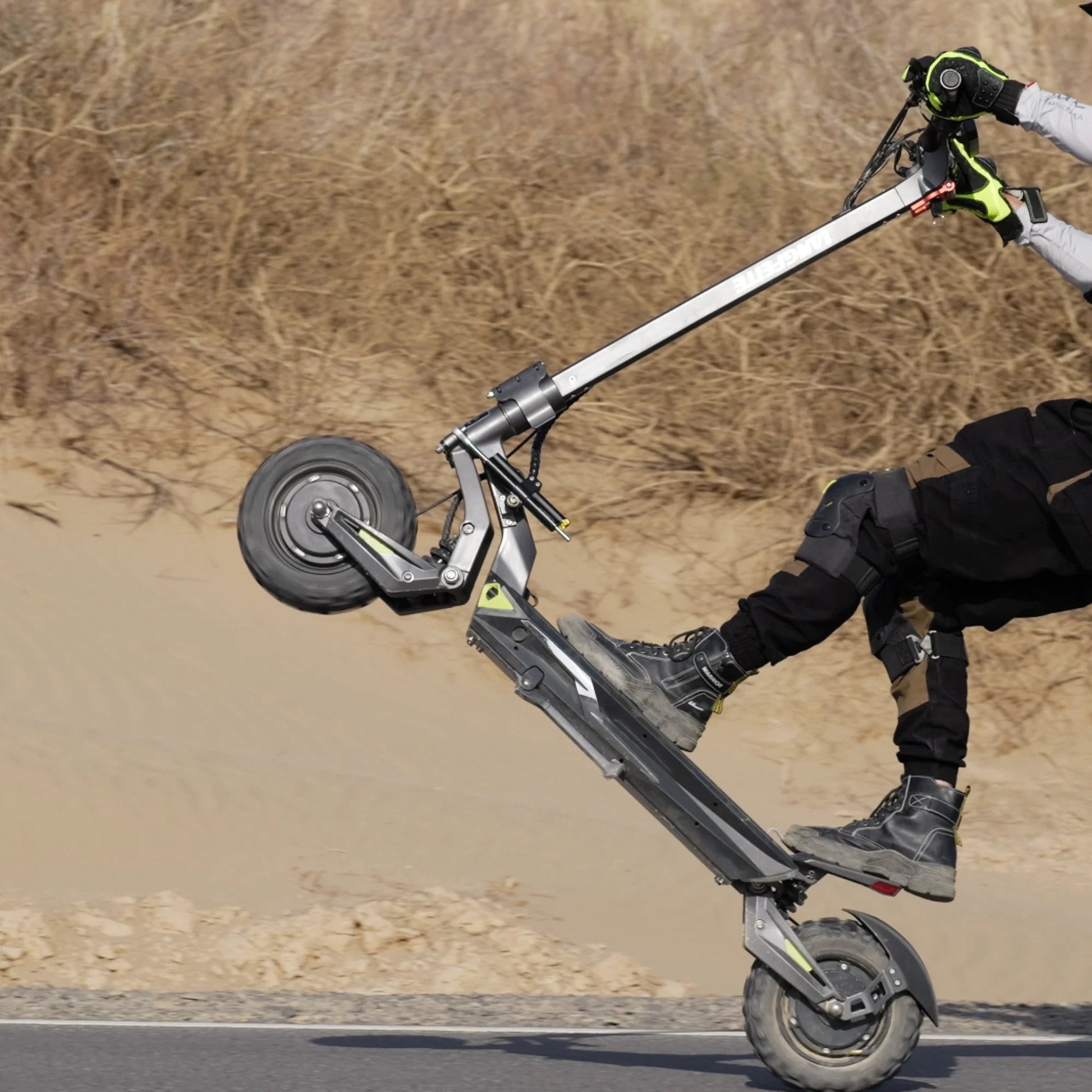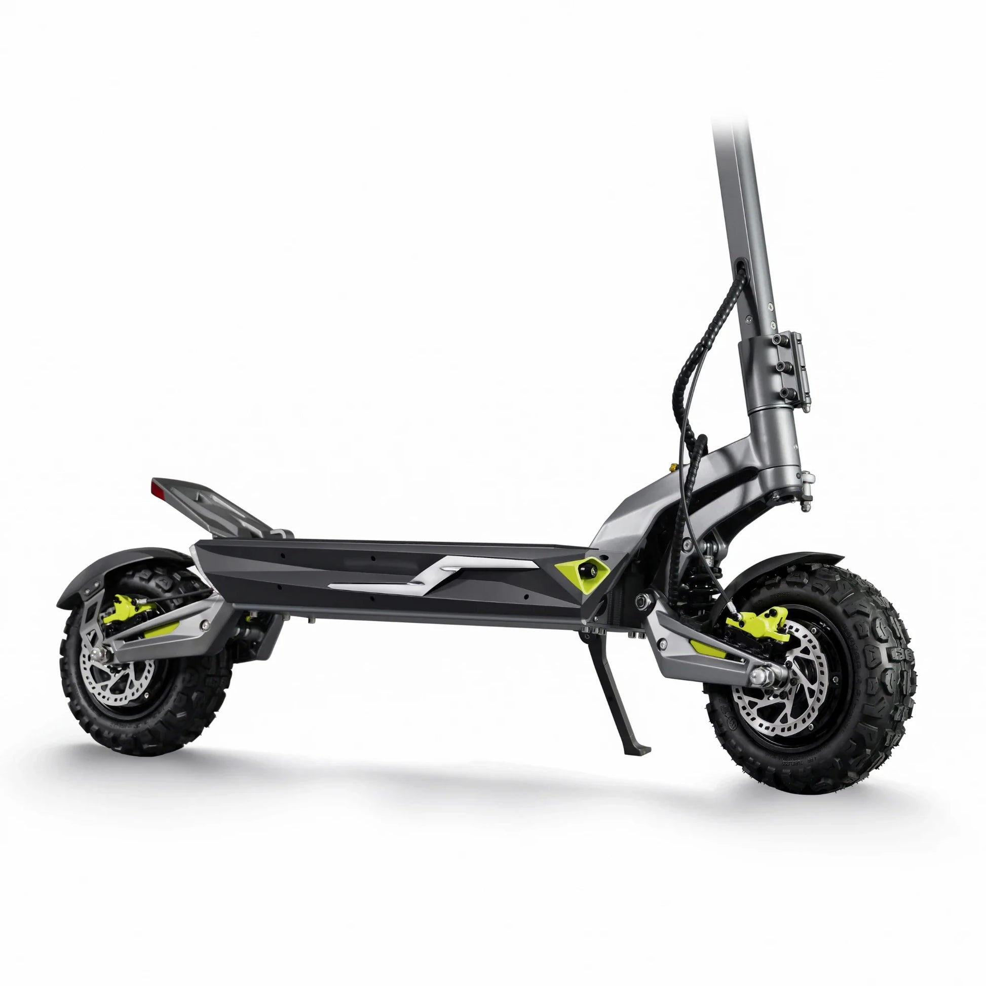La sicurezza ad alte prestazioni è fondamentale. Il monopattino vanta freni a disco completamente idraulici anteriori e posteriori con rotori da 140 mm, garantendo un arresto immediato. Ulteriore sicurezza e stabilità alle alte velocità sono fornite da un ammortizzatore di sterzo integrato, che previene l'oscillazione del manubrio.