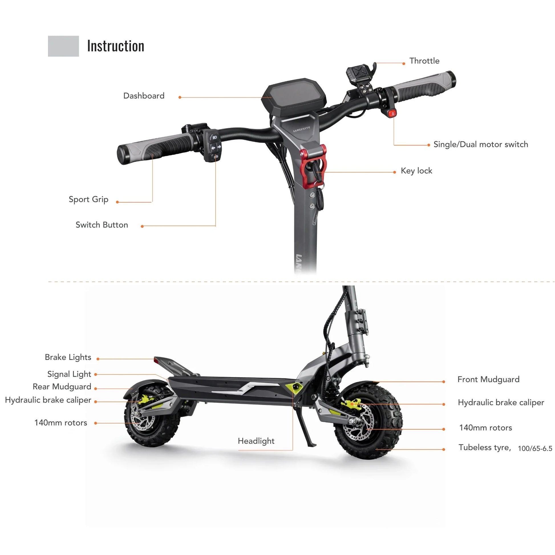 I grandi pneumatici senza camera d'aria da 11 pollici assicurano aderenza e comfort ottimali. Poiché non hanno camere d'aria, c'è meno probabilità di forature, consentendo al contempo la guida a una pressione inferiore per un migliore contatto con la superficie. La dimensione dello pneumatico (100/65-6.5) garantisce stabilità in curva e affidabilità su superfici bagnate o irregolari.