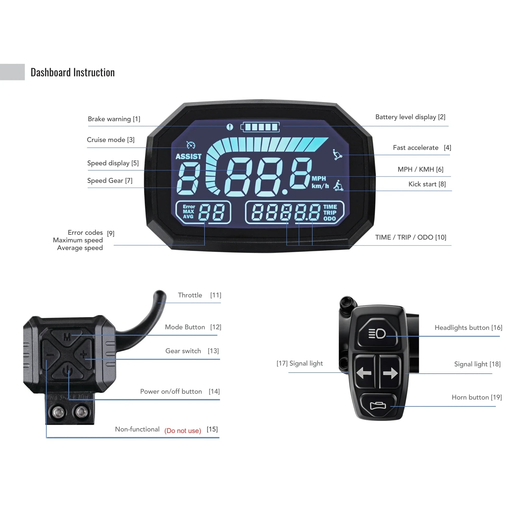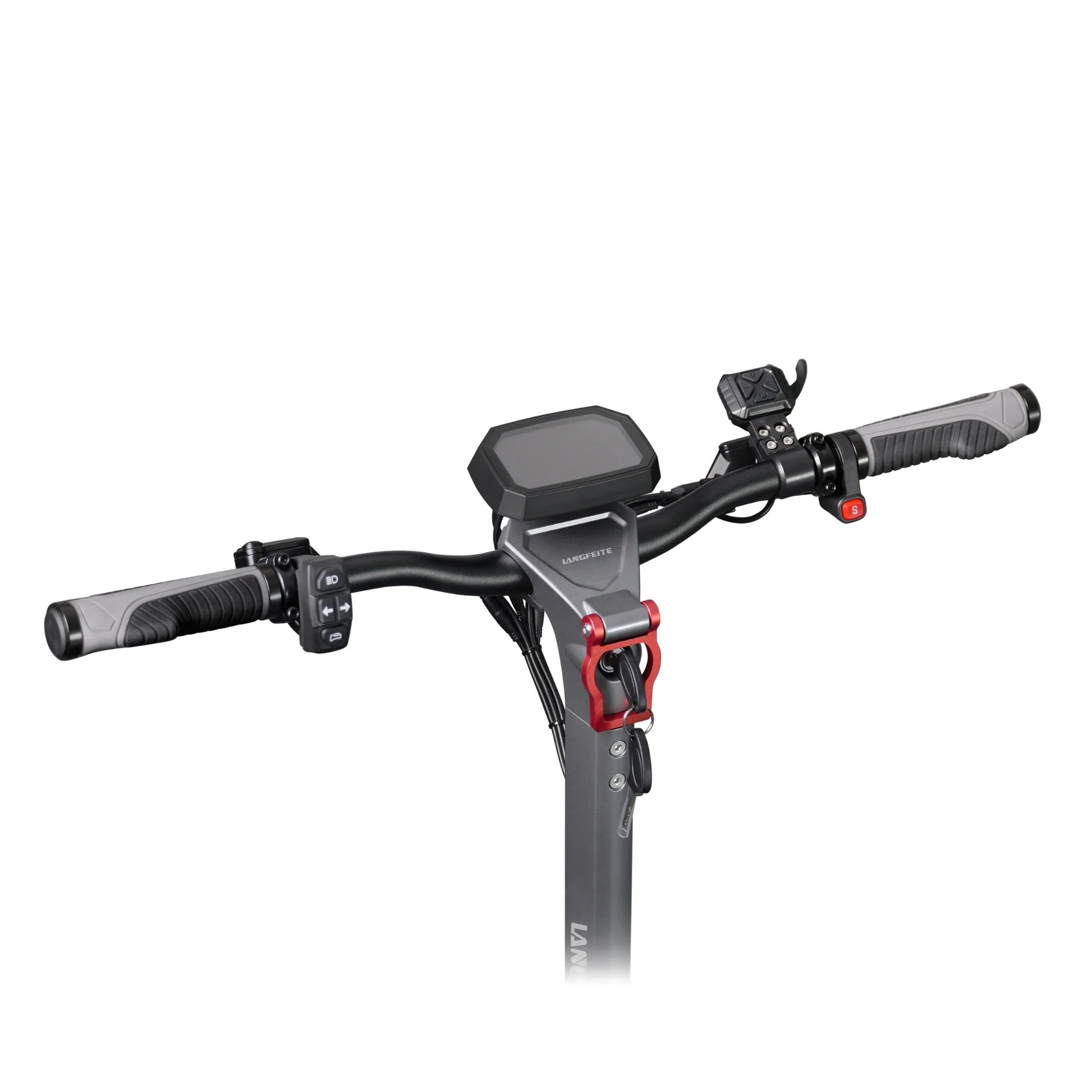 Al centro del manubrio si trova un ampio display LCD a colori che mostra tutte le informazioni chiave: velocità, stato della batteria, distanza percorsa e marcia selezionata. Per una maggiore sicurezza, il monopattino è dotato di un blocco fisico con chiave (Key lock), che impedisce l'avvio non autorizzato, e sul manubrio troverete anche gli interruttori per luci, indicatori di direzione e clacson.