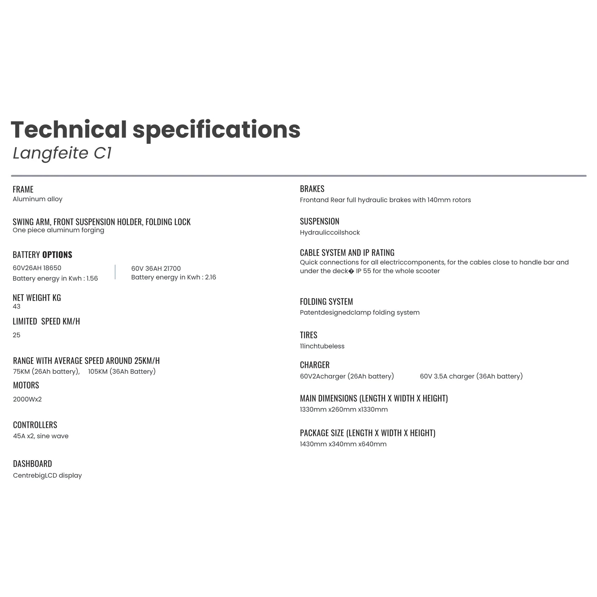 Il monopattino elettrico Langfeite C1 è creato per utenti esigenti e appassionati di adrenalina che non scendono a compromessi. Grazie alla sua potenza eccezionale, alla lunga autonomia e alla costruzione robusta, è l'ideale per chi necessita di un mezzo di trasporto affidabile per lunghe distanze o desidera godersi una guida dinamica su terreni vari. Se state cercando un monopattino che combini velocità, comfort e tecnologia di alto livello, il C1 è la scelta giusta per voi.