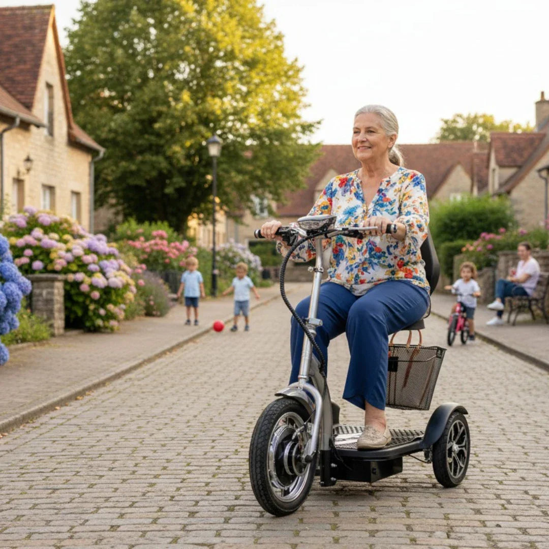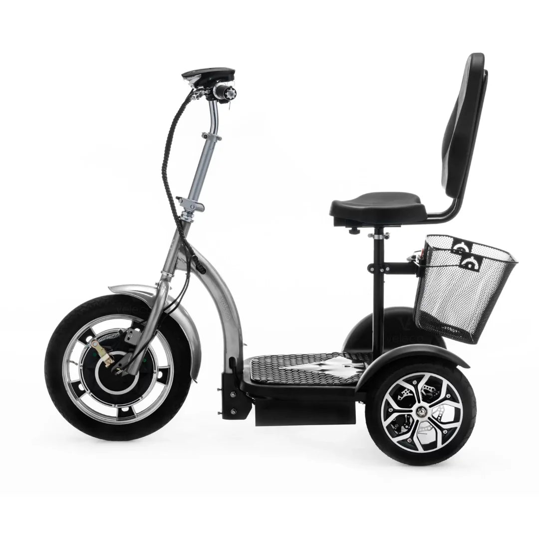 Despite its compact design, safety is well taken care of with the ZT16. It is equipped with a reliable front drum brake and a mechanical disc brake for effective stopping. For better visibility in traffic, a powerful front LED light and a brake light are provided. A comfortable and adjustable seat with a backrest ensures a pleasant ride, while the stable three-wheel design offers a sense of safety and balance.
